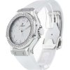 Hublot Big Bang, Steel, White Diamonds, 38mm watch, Stainless Steel case with brushed and polished finishes, Reference 361.SE.2010.RW.1104. Case center (edge) lateral white composite resin inserts. This model has Matte white dial with applied brushed finished stainless steel “applique” style alternating Arabic Numerals and Index hour markers. Brushed finished stainless steel hands with luminous filled tips (minutes and hours hands semi-skeleton). Printed minute track with 5-minute Arabic numerals intervals on the outer perimeter of the dial. Stainless steel Push/pull crown with white rubber center/insert with the Hublot logo. The dial closed by a Scratch-resistant Sapphire Crystal with Anti-reflective Treatment. The watch is equipped fixed Stainless steel bezel set with 126 diamonds weighing +/- 0.87 carats. The watch is Hublot quartz/battery powered Caliber HUB 2900, contains 7 Jewels and has an approximate power reserve of 3-5 years. This model presented on a White Structured Lined Rubber Strap with Stainless Steel Deployant Buckle Clasp. The water resistance is up to 100m/330ft (10 ATM).