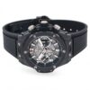 Hublot Big Bang Unico Black Magic, 42mm watch, black ceramic case, satin/brushed finished with fine polished corners, Reference 441.CI.1170.RX. This model has Sapphire crystal transparent dial. Applied applique style Arabic numerals and index hour markers with luminous fill. Black dial flange with a minute/seconds track. Bold brushed finished hands with luminous fill (minutes and hours hands semi-skeleton). Small running seconds sub-dial hand located at the 9 o’clock position. Date window located between the 3 o’clock positions. Screw-down crown. The dial closed by a Scratch-resistant Sapphire Crystal with Anti-reflective Treatment. Of Sapphire Crystal made transparent case back. Chronograph stopwatch functions: column wheel chronograph mechanism; features a Flyback function, which allows instant restarting of the chronograph with a single push of the button; large central seconds counter with the “H” logo as a counter-weight; 60-minute counter sub-dial at 3 o’clock. The watch is equipped fixed black ceramic bezel, secured 6 immediately recognizable Hublots signature “H” screws style of Titanium. The watch is Hublot Caliber HUB 1280 UNICO Manufacture Self-winding Chronograph Flyback Movement with Column Wheel automatic movement, contains 43 Jewels and has an approximate power reserve of 72 hours. This model presented on a Black Structured Rubber Strap with Black Ceramic and Black-plated Titanium Deployant Buckle Clasp. The water resistance is up to 100m/330ft (10 ATM).