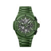 Hublot Big Bang Unico Black Magic, 44mm watch, microblasted and polished black ceramic case, Reference 421.CI.1170.RX. Case sides and bezel base black composite resin inserts. This model has Matte Black Skeleton Dial with “Applique” style alternating Arabic Numerals and index hour markers with luminous fill. Raised/tapered black inner bezel flange on the perimeter of the dial with white printed minute/seconds track and printed 5 seconds increments in Arabic numerals. The minute and hour hands with luminous filled tops and skeletonized bottoms. Date window with white background located at the 3 o’clock position. Small running seconds sub-dial hand located at the 9 o’clock position. Chronograph/Stopwatch functions: column wheel chronograph; Flyback function, allows for instant restarting of the chronograph with a single push of the button; large central seconds counter hand; 60-minute counter sub-dial located at the 3 o’clock position. The chronograph is adjusted using Titanium round shaped buttons. Titanium crown with function Screw down with black rubber around for enhanced grip. The dial closed by a Scratch-resistant Sapphire Crystal with Anti-reflective Treatment. Of Sapphire Crystal made transparent case back. The watch is equipped fixed microblasted and polished black ceramic bezel, secured 6 immediately recognizable Hublots signature “H” screws style of Titanium. The watch is Hublot Caliber UNICO 2 HUB1280 Manufacture Self-winding Chronograph Flyback Movement with Column Wheel, contains 43 Jewels and has an approximate power reserve of 72 hours. This model presented on a black Structured Lined Rubber Straps with Black Ceramic and Titanium Deployant Buckle Clasp. Straps are easily interchangeable via the quick-release buttons, located on the top and bottom central lugs (this watch is delivered with a single strap only). The water resistance is up to 100m/330ft (10 ATM).