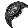 Hublot Big Bang Unico Black Magic, 44mm watch, microblasted and polished black ceramic case, Reference 421.CI.1170.RX. Case sides and bezel base black composite resin inserts. This model has Matte Black Skeleton Dial with “Applique” style alternating Arabic Numerals and index hour markers with luminous fill. Raised/tapered black inner bezel flange on the perimeter of the dial with white printed minute/seconds track and printed 5 seconds increments in Arabic numerals. The minute and hour hands with luminous filled tops and skeletonized bottoms. Date window with white background located at the 3 o’clock position. Small running seconds sub-dial hand located at the 9 o’clock position. Chronograph/Stopwatch functions: column wheel chronograph; Flyback function, allows for instant restarting of the chronograph with a single push of the button; large central seconds counter hand; 60-minute counter sub-dial located at the 3 o’clock position. The chronograph is adjusted using Titanium round shaped buttons. Titanium crown with function Screw down with black rubber around for enhanced grip. The dial closed by a Scratch-resistant Sapphire Crystal with Anti-reflective Treatment. Of Sapphire Crystal made transparent case back. The watch is equipped fixed microblasted and polished black ceramic bezel, secured 6 immediately recognizable Hublots signature “H” screws style of Titanium. The watch is Hublot Caliber UNICO 2 HUB1280 Manufacture Self-winding Chronograph Flyback Movement with Column Wheel, contains 43 Jewels and has an approximate power reserve of 72 hours. This model presented on a black Structured Lined Rubber Straps with Black Ceramic and Titanium Deployant Buckle Clasp. Straps are easily interchangeable via the quick-release buttons, located on the top and bottom central lugs (this watch is delivered with a single strap only). The water resistance is up to 100m/330ft (10 ATM).