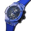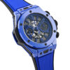 Hublot Big Bang Unico Blue Magic, 42mm watch, blue ceramic case, satin/brushed finished with fine polished corners, Reference 441.ES.5119.RX. This model has Blue and Matte Black Skeleton dial with applied applique style Arabic numerals and index hour markers with luminous fill. Blue dial flange with a minute/seconds track. Bold blue brushed finished hands with luminous fill (minutes and hours hands semi-skeleton). Small running seconds sub-dial hand located at the 9 o’clock position. Date window located between the 3 o’clock positions. Screw-down crown. The dial closed by a Scratch-resistant Sapphire Crystal with Anti-reflective Treatment. Of Sapphire Crystal made transparent case back. Chronograph stopwatch functions: column wheel chronograph mechanism; features a Flyback function, which allows instant restarting of the chronograph with a single push of the button; large central seconds counter with the “H” logo as a counter-weight; 60-minute counter sub-dial at 3 o’clock. The watch is equipped fixed blue ceramic bezel, secured 6 immediately recognizable Hublots signature “H” screws style of Titanium. The watch is Hublot Caliber HUB 1280 UNICO Manufacture Self-winding Chronograph Flyback Movement with Column Wheel automatic movement, contains 43 Jewels and has an approximate power reserve of 72 hours. This model presented on a Black and Blue Structured Lined Rubber Strap with Black Ceramic and Black-plated Titanium Deployant Buckle Clasp. The water resistance is up to 100m/330ft (10 ATM).