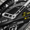 Hublot Big Bang Unico Golf  , Carbon fiber and gray Texalium upper layer case, thanks to which even the large size 45mm x 18.01mm makes the watch but it’s extremely lightweight at just 98 grams because, which is important when playing golf. Reference 416.YS.1120.VR. In this model, you can see well get a good look at the movement and how it works, as the entire thing is skeletonized. The dial for the Hublot Big Bang Unico Golf is a matte black ring with a central bridge and a secondary bridge to hold the 6:00 clock indicator in place. The rest is left open to give the wearer a view of the wheels for the shot and hole counters and parts of the gear train. The applied hour markers, skeletonized minute and hour hands are rhodium plated and filled with lume for low-light legibility. Black composite resin bezel lug and case band.  Black dial flange with minute/seconds track and applied hour markers with luminous fill. Golf course mechanical scorecard: hole, shot and total counters on the dial; controlled and reset via the buttons on the case edges. Down at six o’clock, a running total of the player’s 18-hole score is kept with a pair of discs. At eight o’clock is a tee-shaped pusher that resets the whole thing back to zero.  The chronograph is adjusted using rectangulars buttons; located at 2 and 4 o’clock positions– one adds a stroke to the player’s score, while the second advances the game one hole. The dial closed by a Scratch-resistant Sapphire Crystal with Anti-reflective Treatment. Of Sapphire Crystal made transparent case back. The watch is equipped fixed bezel of Carbon fiber with gray Texalium upper layer and secured 6 immediately recognizable Hublots signature “H” black screws of PVP polished titanium. The watch is HUB1580 UNICO manufacture self-winding movement, contains 43 Jewels and has an approximate power reserve of 72 hours. This model presented on a Black rubber with white calf leather strap with Black Ceramic and Black-plated Titanium Deployant Buckle Clasp. The water resistance is up to 100m/330ft (10 ATM).