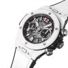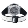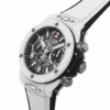 Hublot Big Bang Unico White ceramic, 42mm watch. White ceramic case, satin/brushed finished with fine polished corners, Reference 441.HX.1170.RX. This model has Matte Black Skeleton dial with applied applique style Arabic numerals and index hour markers with luminous fill. Black composite resin bezel lug and case band. Black dial flange with a minute/seconds track. Arabic numeral minute markers at 5 minute interval. Bold silver-tone brushed finished hands with luminous fill (minutes and hours hands semi-skeleton). Small running seconds sub-dial hand located at the 9 o’clock position. Date window located between the 3 o’clock positions. Screw-down crown. The dial closed by a Scratch-resistant Sapphire Crystal with Anti-reflective Treatment. Of Sapphire Crystal made transparent case back. Chronograph stopwatch functions: column wheel chronograph mechanism; features a Flyback function, which allows instant restarting of the chronograph with a single push of the button; large central seconds counter with the “H” logo as a counter-weight; 60-minute counter sub-dial at 3 o’clock. The watch is equipped fixed polished White ceramic bezel, secured 6 immediately recognizable Hublots signature “H” screws style of Titanium. The watch is Hublot Caliber HUB 1280 UNICO Manufacture Self-winding Chronograph Flyback Movement with Column Wheel automatic movement, contains 43 Jewels and has an approximate power reserve of 72 hours. This model presented on a Black and White Structured Lined Rubber Strap with White Ceramic and Black-plated Titanium Deployant Buckle Clasp. The water resistance is up to 100m/330ft (10 ATM).