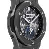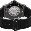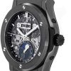 Hublot Classic Fusion Aerofusion Moonphase 42mm Black Magic watch, polished black ceramic case with brushed finished top and bottom center links between the lugs, Reference 547.CX.0170.LR. This model has transparent sapphire crystal main dial with applied polished finished index hour markers and polished finished hands. Black dial flange on the dial perimeter with fine printed minute/seconds track. Calendar functions: day and month windows located beneath the 12 o’clock position: day and month discs with black printed skeletonized date numbers, white background located at the display windows to highlight the current date; date displayed on the perimeter of the sub-dial at the 6 o’clock position; moonphase display sub-dial at the 6 o’clock position. Polished black ceramic crown engraved with the Hublot logo. The dial closed by a Scratch-resistant Sapphire Crystal with Anti-reflective Treatment. Of Sapphire Crystal made transparent case back. The watch is equipped fixed black ceramic bezel with a brushed finished top and polished finished beveled edge, secured with 6 polished “H” style titanium screws. Black composite resin “bezel lug” sandwiched between the bezel and case. The watch is self-winding mechanical Hublot Caliber HUB1131, contains 25 Jewels and has an approximate power reserve of 42 hours. This model presented on a black rubber strap with a stiched black alligator leather top with Black PVD Stainless Steel Deployant Buckle Clasp. The water resistance is up to 50m/150ft (5 ATM).