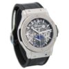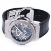 Hublot Classic Fusion Aerofusion Moonphase Titanium 45mm watch, Satin-finished and Polished Titanium case with brushed finished top and bottom center links between the lugs, Reference 517.NX.0170.LR. This model has Transparent sapphire crystal main dial with applied polished finished stainless steel index hour markers and polished finished stainless steel hands. Black inner bezel flange on the perimeter of the dial with fine printed minute/seconds track. Calendar functions: Day and month windows located beneath the 12 o’clock position. Day and month discs with black printed skeletonized date numbers, white background located at the display windows to highlight the current date; Date displayed on the perimeter of the sub-dial at the 6 o’clock position; Moonphase display sub-dial at the 6 o’clock position. Polished titanium crown engraved with the Hublot logo. The dial closed by a Scratch-resistant Sapphire Crystal with Anti-reflective Treatment. Of Sapphire Crystal made transparent case back. The watch is equipped fixed titanium bezel with a brushed finished top and polished finished beveled edge, secured with 6 polished “H” style titanium screws. Black composite resin “bezel lug” sandwiched between the bezel and case. The watch is Hublot Caliber HUB1131 Self-winding Moonphase Movement, contains 25 Jewels and has an approximate power reserve of 42 hours. This model presented on a Black rubber strap with a stiched black alligator leather top with Stainless Steel Deployant Buckle Clasp. The water resistance is up to 50m/150ft (5 ATM).