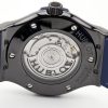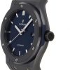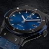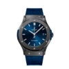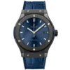 Hublot Classic Fusion Automatic 42mm watch, polished black ceramic case with brushed finished center links between the lugs, Reference 542.CM.7170.LR. This model has Satin-finished Blue Sunray dial with silver-tone polished rhodium plated hands and applied brushed finished stainless steel “applique” style index hour markers. Date window located the 3 o’clock positions. Polished black ceramic crown with rubber tip insert. It has the Hublot logo engraved on it. The dial closed by a Scratch-resistant Sapphire Crystal with Anti-reflective Treatment. Of Sapphire Crystal transparent case back made. The watch is equipped fixed Black ceramic bezel with brushed finished top and polished finished beveled edges, secured with 6 polished “H” style titanium screws. Blue composite resin “bezel lug” sandwiched between the bezel and case. The watch is self-winding mechanical Hublot Caliber HUB1110, contains 21 Jewels and has an approximate power reserve of 42 hours. This model presented on a blue rubber strap with a stiched blue (alligator) leather top with Black-plated Stainless Steel Push Button Folding Clasp. The water resistance is up to 50m/150ft (5 ATM).