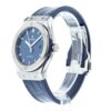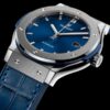 Hublot Classic Fusion Automatic 42mm watch, Grey Satin-finished and polished titanium case with brushed finished top and bottom center links between the lugs, Reference 542.NX.7170.LR. This model has Blue sunray satin finished dial with silver-tone polished finished stainless steel hands and applied polished finished stainless steel index hour markers. Date window located the 3 o’clock positions. Polished titanium crown with Pull / Press function. It has the Hublot logo engraved on it. The dial closed by a Scratch-resistant Sapphire Crystal with Anti-reflective Treatment. Of Sapphire Crystal, transparent case back made. The watch is equipped fixed Grey Titanium bezel with a brushed finished top and polished finished beveled edge, secured with 6 polished “H” style titanium screws. Blue composite resin “bezel lug” sandwiched between the bezel and case. The watch is self-winding mechanical Hublot Caliber HUB1110 contains 21 Jewels and has an approximate power reserve of 42 hours. This model presented on a blue rubber strap with a stiched blue (alligator) leather inlay with Stainless Steel Deployant Buckle Clasp. The water resistance is up to 50m/150ft (5 ATM).