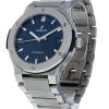 Hublot Classic Fusion Automatic 45mm watch, Grey Satin-finished and polished titanium case with brushed finished top and bottom center links between the lugs, Reference 510.NX.7170.NX. This model has Satin-finished Blue Sunray dial with silver-tone polished rhodium plated hands and applied rhodium plated index hour markers. Date window located the 3 o’clock positions. Polished titanium crown with Pull / Press function. It has the Hublot logo engraved on it. The dial closed by a Scratch-resistant Sapphire Crystal with Anti-reflective Treatment. Of Sapphire Crystal transparent case back made. The watch is equipped fixed satin-finished and polished Grey Titanium bezel with a brushed finished top and polished finished beveled edge, secured with 6 polished “H” style titanium screws. Blue composite resin “bezel lug” sandwiched between the bezel and case. The watch is self-winding mechanical Hublot Caliber HUB1112, contains 25 Jewels and has an approximate power reserve of 42 hours. This model presented on a Satin-finished and Polished Titanium Bracelet with Titanium Deployant Buckle Clasp. The water resistance is up to 50m/150ft (5 ATM).