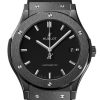Hublot Classic Fusion Automatic 45mm watch, polished black ceramic case with brushed finished top and bottom center links between the lugs, Reference 511.CM.1171.RX. This model has Matte black lacquered dial with silver-tone polished rhodium plated hands and brushed finished stainless steel “applique” style index hour markers. Date window located the 3 o’clock positions. Polished black ceramic crown with rubber tip insert. It has the Hublot logo engraved on it. The dial closed by a Scratch-resistant Sapphire Crystal with Anti-reflective Treatment. Of Sapphire Crystal made transparent case back. The watch is equipped fixed Black ceramic bezel with brushed finished top and polished finished beveled edges, secured with 6 polished “H” style titanium screws. Black composite resin “bezel lug” sandwiched between the bezel and case. The watch is self-winding mechanical Hublot Caliber HUB1112, contains 25 Jewels and has an approximate power reserve of 42 hours. This model presented on a black Lined rubber strap with Black-plated Stainless Steel Push Button Folding Clasp. The water resistance is up to 50m/150ft (5 ATM).