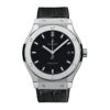 Hublot Classic Fusion Automatic 45mm watch, Grey Satin-finished and polished titanium case with brushed finished top and bottom center links between the lugs, Reference 511.NX.1171.LR. This model has flat matte black dial with silver-tone polished rhodium plated hands and applied polished finished stainless steel index hour markers. Date window located the 3 o’clock positions. Polished titanium crown with Pull / Press function. It has the Hublot logo engraved on it. The dial closed by a Scratch-resistant Sapphire Crystal with Anti-reflective Treatment. Of Sapphire Crystal transparent case back made. The watch is equipped fixed Grey Titanium bezel with a brushed finished top and polished finished beveled edge, secured with 6 polished “H” style titanium screws. Black composite resin “bezel lug” sandwiched between the bezel and case. The watch is self-winding mechanical Hublot Caliber HUB1110 contains 21 Jewels and has an approximate power reserve of 42 hours. This model presented on a black Alligator/Crocodile Leather strap with Stainless Steel Deployant Buckle Clasp. The water resistance is up to 50m/150ft (5 ATM).