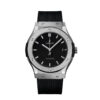 Hublot Classic Fusion Ceramic King Gold 45mm watch. Polished black ceramic case with brushed finished top and bottom center links between the lugs, Reference 511.CO.1181.RX. This model has flat matte black lacquered dial with applied brushed finished king gold toned “applique” style index hour markers and polished king gold plated hands. Date window located the 3 o’clock positions. Solid polished 18kt rose gold crown Pull / Press function and engraved with the Hublot logo. The dial closed by a Scratch-resistant Sapphire Crystal with Anti-reflective Treatment. Of Sapphire Crystal, transparent case back made. The watch is equipped fixed Solid 18kt rose gold bezel, with a brushed finished top & polished finished beveled edge, secured with 6 polished “H” style titanium screws. Black composite resin “bezel lug” sandwiched between the bezel and case. The watch is self-winding mechanical Hublot Caliber HUB1112, contains 21 Jewels and has an approximate power reserve of 42 hours. This model presented on a Black Lined Rubber Strap with 18K King Gold and Black PVD Stainless Steel Deployant Buckle Clasp. The water resistance is up to 50m/150ft (5 ATM).