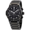 Hublot Classic Fusion Chronograph Automatic 45mm Black Magic watch, polished and satin-finished black ceramic case with brushed finished top and bottom center links between the lugs, Reference 520.CM.1170.CM. This model has Matte black dial with applied brushed finished rhodium plated index hour markers and polished rhodium plated hands. The watch has Small-seconds sub-dial located at the 3 o’clock position. Chronograph/Stopwatch function: large central seconds counter with the “H” logo as a counter-weight; 30-minute sub-dial counter located at the 9 o’clock position. Date window located the 6 o’clock positions. Polished black ceramic crown with the Hublot logo. The dial closed by a Scratch-resistant Sapphire Crystal with Anti-reflective Treatment. Of Sapphire Crystal made transparent case back. The watch is equipped fixed black ceramic bezel with a brushed finished top and polished finished beveled edge, secured with 6 polished “H” style titanium screws. Black composite resin “bezel lug” sandwiched between the bezel and case. The watch is self-winding mechanical Hublot Caliber HUB1143, contains 59 Jewels and has an approximate power reserve of 42 hours. This model presented on a Black ceramic bracelet with polished outer links and brushed finished center links with Black-plated Stainless Steel Deployant Buckle Clasp. The water resistance is up to 50m/150ft (5 ATM).