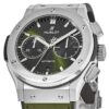 Hublot Classic Fusion Chronograph Automatic 45mm watch, Satin-finished and polished titanium case with brushed finished top and bottom center links between the lugs, Reference 521.NX.8970.LR. This model has Green sunray satin finished dial with silver-tone polished rhodium plated hands and brushed finished stainless steel “applique” style index hour markers. Small-seconds sub-dial located at the 3 o’clock position. Chronograph/Stopwatch function:  large central seconds counter with the “H” logo as a counter-weight; 30-minute sub-dial counter located at the 9 o’clock position. Polished titanium chronograph buttons. Date window located the 6 o’clock positions. Polished titanium crown with the Hublot logo. The dial closed by a Scratch-resistant Sapphire Crystal with Anti-reflective Treatment. Of Sapphire Crystal made transparent case back. The watch is equipped fixed Titanium bezel with brushed finished top and polished finished beveled edges, secured with 6 polished “H” style titanium screws. Black composite resin “bezel lug” sandwiched between the bezel and case. The watch is self-winding mechanical Hublot Caliber HUB1143, contains 59 Jewels and has an approximate power reserve of 42 hours. This model presented on a black rubber strap with a stiched green (alligator) leather top with Stainless Steel Deployant Buckle Clasp. The water resistance is up to 50m/150ft (5 ATM).