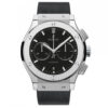 Hublot Classic Fusion Chronograph Titanium 45mm watch. Polished titanium case with brushed finished top and bottom center links between the lugs, Reference 521.NX.1171.RX. This model has Flat Matte Black dial with a polished Rhodium plated hands. Applied brushed finished Stainless Steel “applique” style index hour markers. Minute markers around the outer rim. Small-seconds sub-dial located at the 3 o’clock position. Chronograph/Stopwatch function: large central seconds counter with the “H” logo as a counter-weight; 30-minute sub-dial counter located at the 9 o’clock position. Polished titanium chronograph buttons. Date window located the 6 o’clock positions. Polished titanium crown with Pull/push function. On it, the Hublot logo engraved on it. The dial closed by a Scratch-resistant Sapphire Crystal with Anti-reflective Treatment. Of Sapphire Crystal made transparent case back. The watch is equipped fixed titanium bezel with brushed finished top and polished finished beveled edges, secured with 6 polished “H” style Titanium screws. Black composite resin “bezel lug” sandwiched between the bezel and case. The watch is self-winding mechanical Hublot Caliber HUB1143, contains 59 Jewels and has an approximate power reserve of 42 hours. This model presented on a Black Lined Rubber Straps with Stainless Steel Deployant Buckle Clasp. The water resistance is up to 50m/150ft (5 ATM).