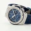 Hublot Classic Fusion Chronograph Titanium Blue 45mm watch. Polished titanium case with brushed finished top and bottom center links between the lugs, Reference 541.NX.7170.LR. This model has Blue Sunray Satin-finished dial with a polished Rhodium plated hands. Applied brushed finished Stainless Steel “applique” style index hour markers. Minute markers around the outer rim. Small-seconds sub-dial located at the 3 o’clock position. Chronograph/Stopwatch function: large central seconds counter with the “H” logo as a counter-weight; 30-minute sub-dial counter located at the 9 o’clock position. Polished titanium chronograph buttons. Date window located the 6 o’clock positions. Polished titanium crown with Pull/push function. On it, the Hublot logo engraved on it. The dial closed by a Scratch-resistant Sapphire Crystal with Anti-reflective Treatment. Of Sapphire Crystal made transparent case back. The watch is equipped fixed titanium bezel with brushed finished top and polished finished beveled edges, secured with 6 polished “H” style Titanium screws. Black composite resin “bezel lug” sandwiched between the bezel and case. The watch is self-winding mechanical Hublot Caliber HUB1153, contains 35 Jewels and has an approximate power reserve of 42 hours. This model presented on a Blue Alligator/Crocodile Leather Straps with Stainless Steel Deployant Buckle Clasp. The water resistance is up to 50m/150ft (5 ATM).