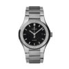 Hublot Classic Fusion Titanium Blue 38mm watch. Grey polished Titanium case with brushed finished top and bottom center links between the lugs, Reference 565.NX.7170.LR. This model has Blue Sunray Satin-finished dial with applied polished index hour markers and rhodium plated hands. Date window located the 3 o’clock positions. Polished titanium crown, Pull/push function and engraved with the Hublot logo. The dial closed by a Scratch-resistant Sapphire Crystal with Anti-reflective Treatment. Of Sapphire Crystal, transparent case back made. The watch is equipped fixed Satin-finished Titanium bezel polished finished beveled edge, secured with 6 polished “H” style Titanium screws. Blue composite resin “bezel lug” sandwiched between the bezel and case. The watch is self-winding mechanical Hublot Caliber HUB1110, contains 21 Jewels and has an approximate power reserve of 42 hours. This model presented on Blue alligator leather strap with Push Button Folding Clasp. The water resistance is up to 50m/150ft (5 ATM).