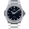 Hublot Classic Fusion Titanium Bracelet 42mm watch. Polished Titanium case with brushed finished top and bottom center links between the lugs, Reference 548.NX.1170.NX. This model has flat matte black dial with applied polished finished Stainless Steel index hour markers and polished finished Stainless Steel hands. Date window located the 3 o’clock positions. Polished titanium crown, Pull/push function and engraved with the Hublot logo. The dial closed by a Scratch-resistant Sapphire Crystal with Anti-reflective Treatment. Of Sapphire Crystal, transparent case back made. The watch is equipped fixed Satin-finished Titanium bezel polished finished beveled edge, secured with 6 polished “H” style Titanium screws. Black composite resin “bezel lug” sandwiched between the bezel and case. The watch is self-winding mechanical Hublot Caliber HUB1110, contains 21 Jewels and has an approximate power reserve of 42 hours. This model presented on Polished and Satin-finished Titanium Bracelet with Titanium Deployant Buckle Clasp. The water resistance is up to 50m/150ft (5 ATM).