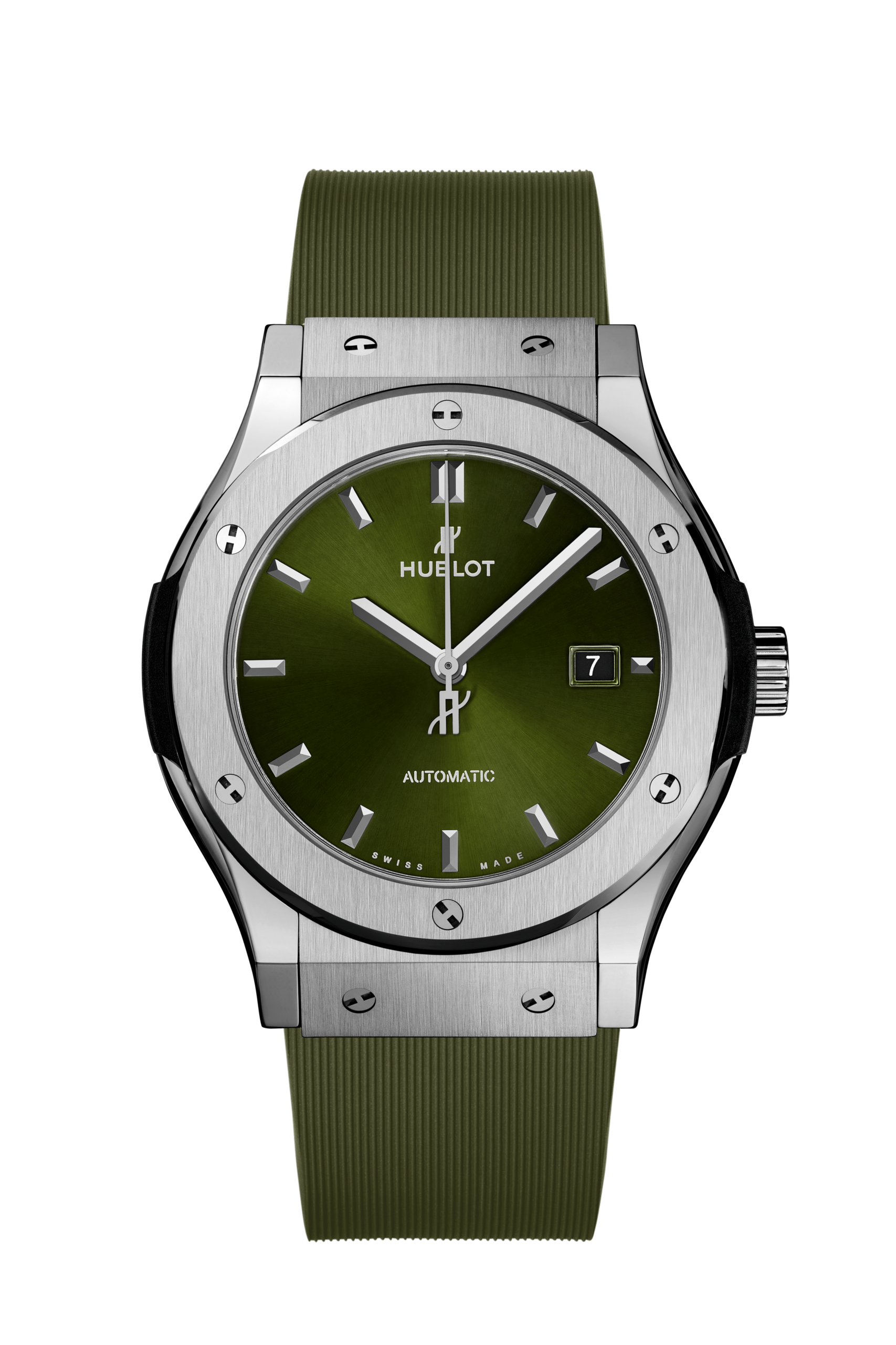 Unworn Hublot Classic Fusion Titanium Green 542.NX.8970.RX. 42 mm, Satin-finished Green Sunray dial, Satin-finished and Polished Titanium case, Sapphire with Anti-reflective Treatment crystal, Satin-finished and Polished Titanium with 6 H-shaped Titanium Screws bezel, HUB1110 calibre, Self-winding Movement, 42 Hours power reserve, Green Lined Rubber Straps with Stainless Steel Deployant Buckle Clasp. Water resistant to 50 m.