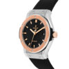 Hublot Classic Fusion Titanium King Gold 42mm watch. Polished titanium case with brushed finished top and bottom center links between the lugs, Reference 542.NO.1181.RX. This model has flat matte black dial with applied brushed finished King Gold toned “applique” style index hour markers and polished King Gold plated hands. Date window located the 3 o’clock positions. Solid polished 18kt King Gold crown Pull / push function and engraved with the Hublot logo. The dial closed by a Scratch-resistant Sapphire Crystal with Anti-reflective Treatment. Of Sapphire Crystal, transparent case back made. The watch is equipped fixed Solid 18kt King Gold bezel, with a brushed finished top and polished finished beveled edge, secured with 6 polished “H” style titanium screws. Black composite resin “bezel lug” sandwiched between the bezel and case. The watch is self-winding mechanical Hublot Caliber HUB1110, contains 21 Jewels and has an approximate power reserve of 42 hours. This model presented on Black liner rubber strap with Stainless Steel Deployant Buckle Clasp. The water resistance is up to 50m/150ft (5 ATM).