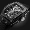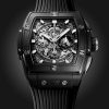 Unworn Hublot Spirit of Big Bang BLACK MAGIC 642.CI.0170.RX. 42 mm, Sapphire dial, Microblasted Black Ceramic case, Sapphire with Anti-reflective Treatment crystal, Microblasted Black Ceramic with 6 H-shaped Titanium Screws bezel, HUB4700 calibre, Self-winding Skeleton Chronograph Movement, 50hours power reserve, Black Structured Lined Rubber Straps with Black Ceramic and Black-plated Titanium Deployant Buckle Clasp. Water resistant to 100 m.