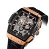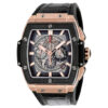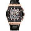 Hublot Spirit of Big Bang King Gold Ceramic 48mm x 42mm watch. Brushed/satin finished 18K King Gold case with polished beveled corners, Reference 641.OM.0183.LR. This model has Sapphire crystal transparent dial with bold brushed finished King Gold minute and hour hands with luminous filled top and skeletonized bottoms. Applied brushed King Gold ‘Applique’ index hour markers with luminous fill. Black inner bezel flange at the dial perimeter with a red minute/seconds track. Small running seconds sub-dial hand located at the 9 o’clock position. Visible skeletonized date wheel. Current date displayed between the 4 and 5 o’clock position, highlighted by a black background and a blue border. Chronograph Stopwatch function: large central seconds counter with the “H” logo as a counter-weight; black-rimmed 30-minute sub-dial counter located at the 3 o’clock position; black-rimmed 12-hour sub-dial counter located at the 6 o’clock position. Brushed and polished 18kt King Gold crown and chrono buttons with black insert. The crown has Hublot logo engraved on it. The dial closed by a Scratch-resistant Sapphire Crystal with Anti-reflective Treatment. Of Sapphire Crystal made transparent case back. The watch is equipped fixed Satin-finished, Polished Black ceramic bezel with Microblasted (dark shade of finishing) recessed zones, secured with 6 polished “H” style Titanium screws. Black composite resin lateral case center-band and bezel lugs. The watch is self-winding Skeleton Chronograph Movement Hublot Caliber HUB 4700, contains 31 Jewels and has an approximate power reserve of 50 hours. This model presented on a Black “Gummy-Alligator” strap: Alligator on the topside and rubber on the underside and edges with 18K King Gold and Black PVD Titanium Deployant Buckle Clasp. The water resistance is up to 100m/330ft (10 ATM).
