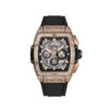 Unworn Hublot Spirit of Big Bang KING GOLD DIAMONDS 642.OX.0180.RX.1104. 42 mm, Sapphire dial, Satin-finished and Polished 18K King Gold case, Sapphire with Anti-reflective Treatment crystal, Polished 18K King Gold Set with 164 Diamonds totaling 0.90ct with 6 H-shaped Titanium Screws bezel, HUB4700 calibre, Self-winding Skeleton Chronograph Movement, 50hours power reserve, Black Structured Lined Rubber Straps with 18K King Gold and Black-plated Titanium Deployant Buckle Clasp. Water resistant to 100 m.