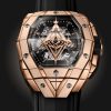 Unworn man’s watch Hublot, Spirit of Big Bang Sang Bleu King Gold, 42mm, Ref# 648.NX.0107.RX.MXM23. The new 2023 product from Hublot has delighted fans of the work of Maxime Plescia-Buchi, who translates the language of his geometric tattoos into an explosive 3D sculptural composition of futuristic watches. A stunning combination of three-dimensional geometric shapes in 18k King Gold gives the barrel-shaped case a new identity: the elongated bezel and case form a striking diamond structure – Buchi’s signature geometric shape. It consists of many individual geometric parts – hexagons, diamonds and triangles – skillfully combined into a single piece. In addition to the 3D effect, the faceted components rise, fall, are highlighted by vertical matte finishes, and polished surfaces. The complex design of the case is fully matched by a sapphire crystal dial with a skeletonized signature Buchi diamond structure in the center: an 18k King Gold large diamond-shaped hand with Super-LumiNova indicates the hours, and a smaller one indicates the minutes. The dodecagonal sapphire crystal has a minute track with 18k King Gold Arabic numerals every 5 minutes, and towards the center, there is a black 10-sided track with 18k King Gold hour markers printed in Arabic numerals. The chronograph includes a thin, large central seconds hand, as well as two subdials with diamond-shaped hands (as far as hands can be called) showing a small seconds at 9 o’clock and a 30-minute chronograph counter at 3 o’clock. He is controlled by polished 18k King Gold pushers at the 2 and 4 o’clock positions. A window between the 4 and 5 o’clock positions shows the date. The polished 18k King Gold crown has an engraved Hublot logo and a rubber shock absorber with grooves for better grip. The anti-reflective sapphire crystal that covers the dial is equally sculptural. It not only provides protection, but also creates increased volume and optical distortion. The back cover is also made of sapphire glass, which makes it possible to see the details of the mechanism with your own eyes and adds a touch of originality. The real highlight of the watch is the complex elongated bezel made of Satin-finished and Polished 18k King Gold, secured with 6 immediately recognizable titanium “H†screws with the Hublots signature inscription. The flawless operation of the watch is ensured by the HUB4700 Self-winding Skeleton Chronograph Movement, which contains 31 jewels and has an approximate power reserve of 50 hours. This model is presented on an elegant and comfortable Black Smooth Rubber Strap and 18k King Gold and Black PVD Titanium Deployant Buckle Clasp. Water resistance is up to 100m/330ft (10 ATM).