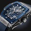 Unworn Hublot Spirit of Big Bang TITANIUM BLUE CERAMIC 642.NL.7170.RX. 42 mm, Sapphire Crystal dial, Satin-finished and Polished Titanium case, Sapphire with Anti-reflective Treatment crystal, Microblasted and Polished Blue Ceramic bezel, HUB4700 calibre, Self-winding Skeleton Chronograph Movement, 50hours power reserve, Black and Blue Structured Lined Rubber Straps with Titanium Deployant Buckle Clasp. Water resistant to 100 m.
