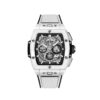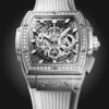 Unworn Hublot Spirit of Big Bang TITANIUM WHITE DIAMONDS 642.NE.2010.RW.1204. 42 mm, Sapphire Crystal dial, Satin-finished and Polished Titanium case, Sapphire with Anti-reflective Treatment crystal, Satin-finished and Polished Titanium Set with 48 Diamonds, 6 H-shaped Titanium Screws bezel, HUB4700 calibre, Self-winding Skeleton Chronograph Movement, 50hours power reserve, White Structured Lined Rubber Straps with Titanium Deployant Buckle Clasp. Water resistant to 100 m.