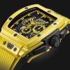 Unworn men’s watch Hublot Spirit of Big Bang Yellow Magic 42mm, Reference 642.CY.011Y.RX -bright splash of color, an impressive sporty style, an example of a masterful combination of geometric shapes with premium materials and the highest precision. The barrel-shaped case made of polished yellow ceramic is a symbol of perfection and one of the brand’s calling cards. The contrast with black elements emphasizes the modern character of the watch. The sapphire crystal dial allows you to appreciate the elegance of the skeletonized design. It is contoured by a yellow minute track with yellow SuperLuminovaâ„¢ index hour markers for excellent legibility even in low light conditions. Large yellow hour and minute hands with a skeletonized lower part and a Super-LumiNova-coated upper part. The date display with the date wheel fully open is located between 4 and 5 o’clock. Adding additional functionality to this model is the chronograph, which includes a large, elegant yellow central seconds hand with the H logo as a counterweight, a yellow 30-minute counter located at 3 o’clock, a yellow seconds counter at 9 o’clock, as well as a small yellow sub-dial at 6 o’clock. It is controlled by black buttons located at the 2 and 4 o’clock positions. In addition, the watch is controlled by a black screw-down Push/Pull crown, engraved with the Hublot logo, covered in rubber with contoured grooves for a better grip. The dial closed by a Scratch-resistant Sapphire Crystal with Anti-reflective Treatment. The case back of the watch is also made of sapphire crystal, allowing you to observe the fantastic work of the watch movement. The real decoration of the watch was the Microblasted and Polished Yellow Ceramic bezel with many angles, edges, alternating textures, secured with 6 immediately recognizable titanium “H†screws. The flawless operation of the watch is ensured by the HUB4700 self-winding skeletonized chronograph movement, which contains 31 jewels and has an approximate power reserve of 50 hours. This model is presented on an elegant and comfortable Yellow and Black Structured Lined Rubber Strap with Black Ceramic and Black-plated Titanium Deployant Buckle Clasp. Water resistance is up to 100m/330ft (10 ATM).