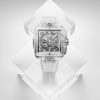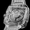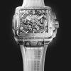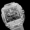 New for 2023, the Hublot Square Bang Unico Sapphire, 42mm, Ref# 821.JX.0120.RT model looks very cool and makes an unforgettable impression with its completely transparent design. A bold, revolutionary square version of the polished Sapphire Crystal case that breaks all conventions and represents the evolution of Hublots DNA, literally squaring the circle of the iconic porthole shape. The square skeletonized Sapphire Crystal dial makes an unforgettable impression. Large silver-tone minute and hour hands with a luminous top and skeletonized bottom and indexes hour markers with a luminous fill ensure perfect legibility in all conditions. The watch has small seconds dial located at the 3 o’clock position. Adding additional functionality to this model is the flyback chronograph, which includes a large, elegant central seconds hand with the H logo as a counterweight, and a 30-minute counter located at 9 o’clock. Polished titanium pushers located at the 2 and 4 o’clock positions operate it. Date window located the 3 o’clock positions. Helps you manage your watch polished titanium crown with the Hublot logo engraved with contoured grooves for improved grip. The dial closed by a Scratch-resistant Sapphire Crystal with Anti-reflective Treatment. The case back of the watch is also made of sapphire crystal, allowing you to observe the fantastic work of the watch movement. The model decorates a fixed square bezel made of polished Sapphire Crystal, secured with six signature Hublots titanium “H†screws. The HUB1280 UNICO Manufacture Self-winding Chronograph Flyback Movement with Column Wheel, which contains 43 jewels and has an approximate power reserve of 72 hours, ensures the watch’s flawless operation. This model is presented on an elegant and comfortable Transparent Structured Lined Strap with Titanium Deployant Buckle clasp. Like the round version of the Hublot Big Bang UNICO, the Square Bang features the company’s One-Click strap release system, which allows you to easily change straps (but only with compatible straps sold by Hublot). The water resistance is up to 100m/330ft (10 ATM).