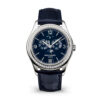 New unworn luxury 18k White Gold ladies’ with a highly refined exterior Patek Philippe Grand Complication watch, with minute repeater, 36mm, Reference 7040/250G-001. The gold dial plate is hand-guilloched with a swirling pattern, then coated with transparent blue enamel revealing the underlying decoration, a rare handcrafts technique known as flinqué enamel. The 18k White Gold Spear-shaped hands and similar hour markers look exquisite on it. The feature of this model is minute repeater with chime by the tuneful sound of its two classic gongs. A practical addition is a small second’s sub-dial located at the 6 o’clock position. 18k White Gold crown with ribbed edge for comfortable grip and logo Patek Philippe. The dial closed by a Scratch-resistant Sapphire Crystal and sapphire-crystal case back (also accompanied by interchangeable). The watch is equipped fixed polished 18k White Gold bezels lit up by a double row of 168 Top Wesselton Pure diamonds (~0.78 ct) set using the “Flamme®” technique. The watch Patek Philippe Calibre R 27 PS Self-winding mechanical movement, containing 39 Jewels, and has a power reserve of min. 43 hours – max. 48 hours. This model presented on ocean blue patinated Alligator leather with square scales, hand-stitched and 18k White Gold Diamond-set 26 diamonds: ~0.18 ct prong buckle. Humidity- and dust-protected only not (water-resistant).