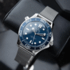 - Launched in 2022, to celebrate 60 years of James Bond, this 42mm Seamaster Diver 300M in stainless steel, has a blue oxalic anodized aluminium dial, with laser engraved waves, inspired by the Seamaster Diver 300M worn by James Bond in 1995’s GoldenEye. A commemorative 60 replaces the diving scale’s traditional inverted triangle.