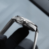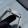 Adding texture to the metallic look is a brushed stainless steel bracelet, in the same elegant mesh style as Bond’s titanium watch in No Time To Die.