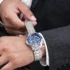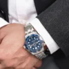 This 42 mm model is crafted from stainless steel and 18K Sedna™ gold, and includes a blue ceramic bezel with a Ceragold™ diving scale. The dial is also polished blue ceramic and features laser-engraved waves and a date window at 6 o’clock.