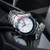 It is presented on a 5-stripe blue, red & grey polyamide Nato Strap; and powered by the exclusive OMEGA Calibre 2507.