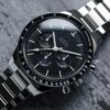 The black step dial features familiar Moonwatch hands, a vintage OMEGA logo, as well as a small seconds sub-dial, 30-minute recorder and 12-hour recorder along with a central chronograph hand. Through the sapphire-crystal caseback, you can see the Calibre 321 inside.