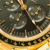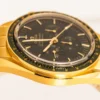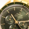 Inspired by the 4th generation Speedmaster, this 42 mm Moonwatch with case and bracelet in 18K Moonshine™ Gold, has a sun-brushed green PVD "step" dial and "Moonwatch" style hands. The green ceramic bezel ring, with OMEGA Ceragold™ tachymeter scale, features the famous dot over 90.