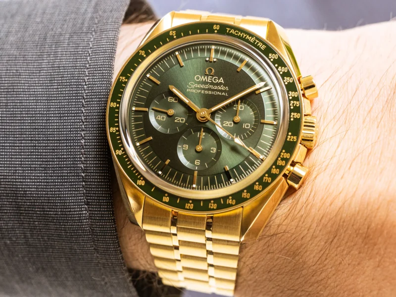 Inspired by the 4th generation Speedmaster, this 42 mm Moonwatch with case and bracelet in 18K Moonshine™ Gold, has a sun-brushed green PVD "step" dial and "Moonwatch" style hands. The green ceramic bezel ring, with OMEGA Ceragold™ tachymeter scale, features the famous dot over 90.