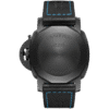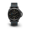 Unworn Men’s Watch Panerai Luminor GMT – 44mm, of matte black ceramic case, Reference PAM01441. The model has Black ‘sandwich’ construction dial with cutout indications and off-white luminous backing. Blackened hands with off-white luminous. This watch is Large Arabic numerals in the 6, 9, 12 o’clock positions and the rest of the hour markers are small Arabic numerals. At the 9 o’clock position of the dial is located small seconds sub-dial with luminous blue leaf-shaped hand. Marked every 15 minutes with bold luminous indices. This Officine Panerai signature element speaks innovation and seamless function. The watch has a dual GMT / 2nd time zone function, which is controlled by a center GMT hand with a luminous fill. Date window located 3 o’clock position. The dial closed by a Scratch-resistant Sapphire Crystal. The watch has Panerai’s (protected as a trademark) instantly recognizable crown protector and screws down the crown of matte black ceramic with a ribbed edge for a comfortable grip. They is a shaped Cushion case and a have solid case back. The watch is equipped fixed polished black ceramic bezel. The Model comes with Automatic mechanical movement Panerai in-house Caliber P.9010/GMT contains 31 Jewels and has an approximate 3-day (72-hour) power reserve. The watch presented on a Black Fabric with Blue Stitching strap with secured by a Tang Buckle Clasp. The water resistance is up to 100m/330ft.