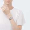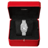 This elegant Panthere de Cartier watch is crafted from stainless steel and bears dimensions of 27mm x 37mm. The case is also integrated with 30-meter water resistant technology and protects a quartz-powered movement at its centre. Some of the most admirable Features of this lady’s Panthere de Cartier watch include its silver dial with blued steel central hands and a highly legible black Roman numeral hour track with an inner minute trail. Sparkling diamonds have been set into the iconic square shape of this watch’s bezel, and a synthetic blue spinel also adds a glamorous finish to this timepiece. Panthere de Cartier watches have been gracing elegant women’s wrists since 1983 and create a sophisticated, feline and ultra-feminine look when paired with best attire. The watch is finished on a detailed stainless steel link bracelet, securing with a comfortable folding clasp.Â