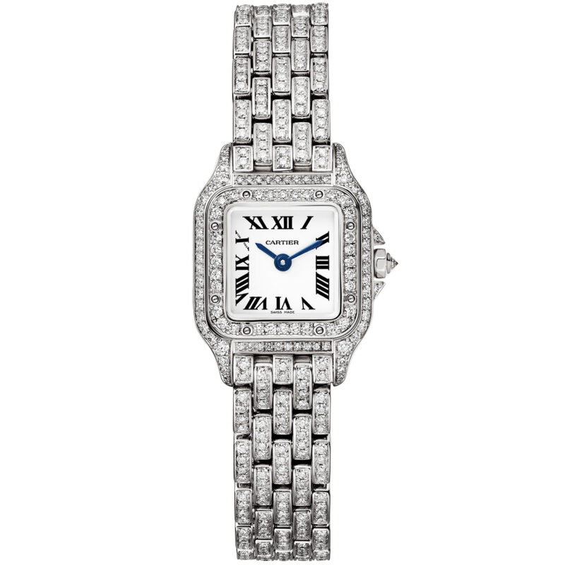 Cartier Panthère de Cartier Mini 18ct White Gold Full Diamond Set Watch HPI01641. 18ct white gold diamond-set 25mm x 20mm case & bezel all on a fully diamond set 18ct white gold bracelet. This ladies watch has a white dial with blued steel hands. Water resistant to 30m and sapphire crystal glass. Quartz movement.Â