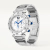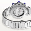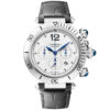 Cartier Pasha de Cartier 41mm Bracelet/Leather Strap Chronograph Watch WSPA0018. Stainless steel 41mm case and bezel all on a matching stainless steel bracelet and comes complete with an additional black leather strap. This men’s watch has a silver dial with blued steel hands and date display at the 4:30 o’clock position. Sapphire crystal glass and water resistant up to 100m. Automatic chronograph movement.