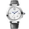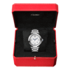 Remaining close to the original Pasha de Cartier watch created in 1943, this men’s Cartier watch Features the collection’s signature rounded case and Arabic numeral hour markers representing the 12, 3, 6 and 9 o’clock locations. This stunning Pasha de Cartier watch for men Features a fluted crown cap adorned with a synthetic cabochon-shaped spinel which contrasts beautifully against the watch’s steel bodywork and its smooth silver flinque dial. Promising an easy to read design, the dial of this men’s Pasha de Cartier watch Features a set of elegantly carved blued steel hands and an inner minute track. Of course, the instantly recognisable Cartier lettering is emblazoned onto the surface of the dial at 12 o’clock, protected underneath a lens crafted from anti reflective sapphire crystal glass. The watch is powered by a mechanical movement with automatic winding – the calibre 1847 MC. It provides an impressive power reserve of 42 hours and beats at a rhythm of 28,800 vibrations per hour. The watch is completed on a stainless steel bracelet with a refined folding clasp for ultimate comfort. Cartier’s innovative Quick Switch technology enables the wearer the change the bracelet with a leather band option when desired.Â