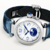 Cartier Pasha de Cartier Moonphase 41mm Men’s Automatic Strap Watch WSPA0030. Stainless steel 41mm case and bezel all on a blue leather strap and comes complete with additional black leather strap. This men’s watch has a silvered guilloche dial with blued steel hands and moonphase display at the 6 o’clock position. Sapphire crystal glass and water resistant up to 100m. Automatic movement.