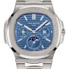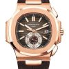 40.5 mm rose gold case, 12.53 mm thick, sapphire-crystal back, screw-down crown, sunburst blue dial with gold applied hour markers with luminescent coating, caliber CH 28-520 C FUS self-winding movement with flyback chronograph, central chronograph hand, 60-minute counter, two time zones: local and home time indication, day/night indication for local time and home time in apertures, date coupled with local time by hand, approximately 45-55 hours of power reserve, rose gold bracelet, Nautilus fold-over clasp buckle. Water resistant to 120 m.