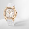 New Patek Philippe Aquanaut Luce luxury Ladies watch, with a larger diameter 38,8mm, 18k Rose Gold, Ref. 5268/200R-001. The automatic wristwatch in the modern Aquanaut sports collection, which perfectly matches the character of this young and dynamic watch line. It has rounded octagonal 18k Rose Gold body and gently curved lugs, with polished flat surfaces and satin-finish sides are unmistakable. On a beautiful Matte white dial with embossed “Aquanaut” harmoniously looks perfectly readable large applied polished Arabic numerals made of 18k Rose Gold with luminescent coating in the form of hour markers. The manufacturer paid special attention to the second track on the outer rim of the dial, on which applied rose gold tones lines with fairly wide luminous marks located every 5 minutes. Large polished luminous hour and minute hands in 18k Rose Gold indicate the time. These are complemented by a slim and elegant 18k Rose Gold second hand (Sweep seconds hand). The presence of a stop-seconds device, which stops the balance when the crown is pulled out, enables the user to set the time to the second. The date window is traditionally at the 3 o’clock position. A polished 18k Rose Gold screw-down crown with a ribbed edge for a comfortable grip and the Patek Philippe logo is the finishing touch to the perfect picture. The dial is covered with a scratch-resistant sapphire crystal. The screw-down case back is also made of sapphire crystal, which allows you to see the magical work of the movement and flawless hand-finish. The elegant highlight of this model is the fixed sparkling 18k Rose Gold bezel set with 48 Top Wesselton Pure diamonds (~1.11 ct) set with textbook precision with polished on the sides. The finish on the side of the bezel is amazing because at first glance, it looks rounded, but upon closer inspection, you can see the crisp edges playing with the light. The model is equipped with a Patek Philippe caliber 26‑330 S C with a self-winding mechanical movement containing 30 jewels and a power reserve of min. 35 hours – max. 45 hours. This beautiful sport chic watch is presented on an Integrated Matt-white strap that continues the visual harmony of the design made of Composite material. He is highly resistant to wear, salt water and UV radiation. The strap are fastens with Patek Philippe’s patented 18k Rose Gold folding clasp, polished and engraved with the Calatrava cross. Opening the clasp reveals the engraved Patek Philippe logo with the word GENEVE. Water resistant up to 120m/394ft (12 ATM).