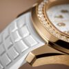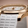 New Patek Philippe Aquanaut Luce Travel Time luxury Ladies watch, with a larger diameter 38,8mm, 18k Rose Gold, Ref. 5269/200R-001. The complex quartz wristwatch in the modern Aquanaut sports collection, which perfectly matches this character of young and dynamic watch line. The rounded octagonal 18k Rose Gold body and gently curved lugs, with polished flat surfaces and satin-finish sides are unmistakable. On a magnificent Matte white dial with embossed “Aquanaut” harmoniously looks perfectly readable large applied polished Arabic numerals made of 18k Rose Gold in the form of hour markers. The manufacturer paid special attention to the second track on the outer rim of the dial, on which applied rose gold tones lines with fairly wide luminous marks located every 5 minutes. Large polished luminous hour and minute hands in 18k Rose Gold indicate the time guarantee perfect readability even in the dark. These are complemented by a slim and elegant 18k Rose Gold second hand (Sweep seconds hand). In addition, this model has an additional skeleton hand, which indicates the time of the second time zone. Its setting is quite simple and is done using the crown. Moving forward one click, it sets the local time in increments of one hour forward or backward. Two clicks set the time and stop the movement. At the 6 o’clock, position there is an aperture for indicating the day and night of the home time zone. A polished 18k Rose Gold screw-down crown with inconspicuous and practical adjustment system with a ribbed edge for a comfortable grip and the Patek Philippe logo is the finishing touch to the perfect picture. The dial is covered with a scratch-resistant sapphire crystal. The screw-down Solid case back is made of 18k Rose Gold. The elegant highlight of this model is the fixed sparkling 18k rose gold bezel set with 48 Top Wesselton Pure round diamonds (~1.11 carats) flawless. The polishing on the sides impresses with classic precision. It also looks amazing because at first glance it looks rounded, but on closer inspection you can see the crisp edges playing with the light. The model is equipped with a Patek Philippe caliber E 23‑250 S FUS 24H with a Quartz movement. This beautiful sport chic watch is presented on an Integrated Matt-white strap that continues the visual harmony of the design made of Composite material. He is highly resistant to wear, salt water and UV radiation. The strap are fastens with Patek Philippe’s patented 18k Rose Gold folding clasp, polished and engraved with the Calatrava cross. Opening the clasp reveals the engraved Patek Philippe logo with the word GENEVE. Water resistant up to 60m/200ft (6 ATM).