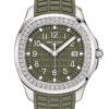 Patek Philippe reinterprets the quartz Aquanaut Luce in stainless steel with a larger diameter (38.8 mm) and a new integrated composite strap. This epitome of contemporary casual chic is attired in a bold khaki-green color adorning the dial and matching strap. Water-resistant to 120m, the rounded octagonal case is enhanced by polished and satin finishes. The bezel is lit up by a row of 48 diamonds (~1.11 ct). The patented folding clasp is secured by four independent catches. Quartz movement. Caliber E 23‑250 S C. Date in an aperture. Sweep seconds. Khaki green, embossed with Aquanaut pattern, gold applied numerals. Steel. Screw-down crown. Solid case back. Water-resistant to 120m. Diameter (10–4 o’clock): 38.8 mm. Height: 7.9 mm. 48 diamonds: ~1.11 ct. (bezel). Composite material, khaki green. Aquanaut fold-over clasp.