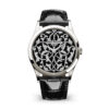 Luxury Patek Philippe Calatrava polished 18k White Gold, 39mm, Reference 5227G-010sleek lines and sophisticated elegance. The minimalistic Black lacquered dial is classic in style and perfect for business attire. On him looks spectacular applied trapeze shaped indexes hour markers, polished 18k White Gold dauphine-style hands and 18k White Gold Dot minute markers around the outer rim. In addition, this model is equipped with a spectacular Center sweep second hand and an aperture-type date at the 3 o’clock position. A polished 18k White Gold Push/pull crown with a ribbed edge for easy grip and the Patek Philippe logo is located on the right side of the case. The dial closed by a Scratch-resistant Sapphire Crystal. Sapphire-crystal too case back, which allows of the case, allows you to see the magical work of the movement with protected by an invisibly hinged dust cover. The watch features an 18k White Gold fixed polished smooth bezel. This model has caliber Patek Philippe Caliber 324 S C, a self-winding mechanical movement containing 29 Jewels, with a power reserve of min. 35 hours – max. 45 hours. She is presented is on shiny dark chestnut Alligator/Crocodile leather strap with square scales, hand-stitched and an 18k White Gold Prong buckle. The water resistance is up to 30m/100ft (3 ATM).